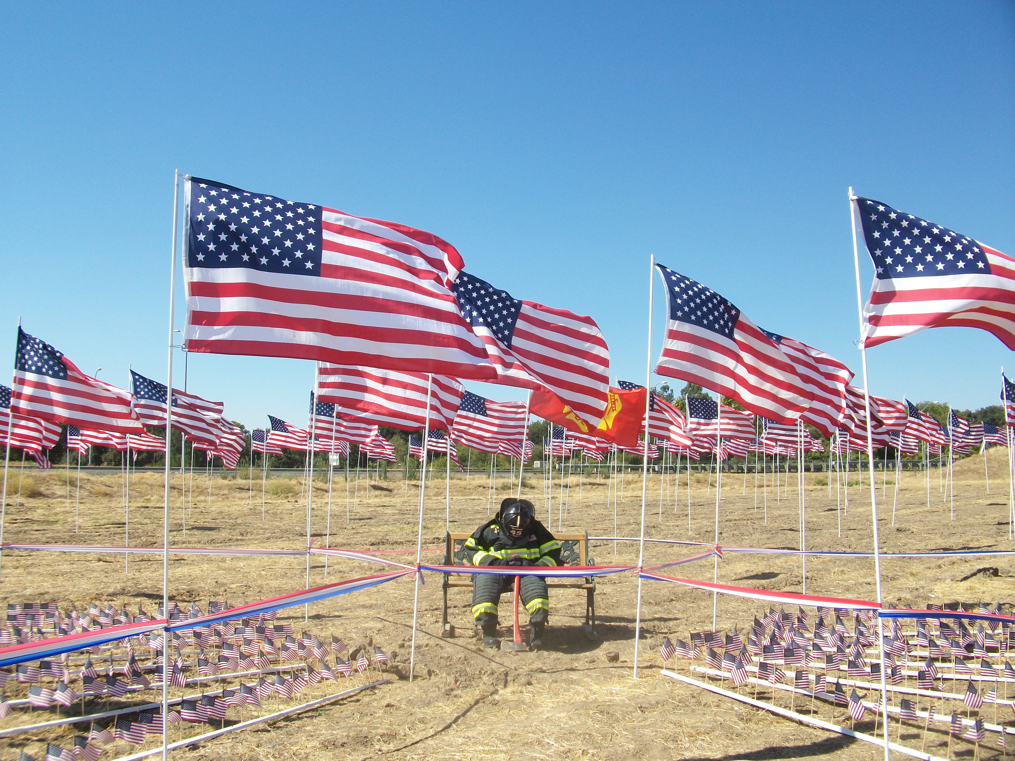 The smaller flags surrounding this set of firefighter gear each represent an emergency services worker who was killed while helping the survivors of the 9/11 terrorist attacks. Photo by Jennifer Trinkle (Photos from the Soul).