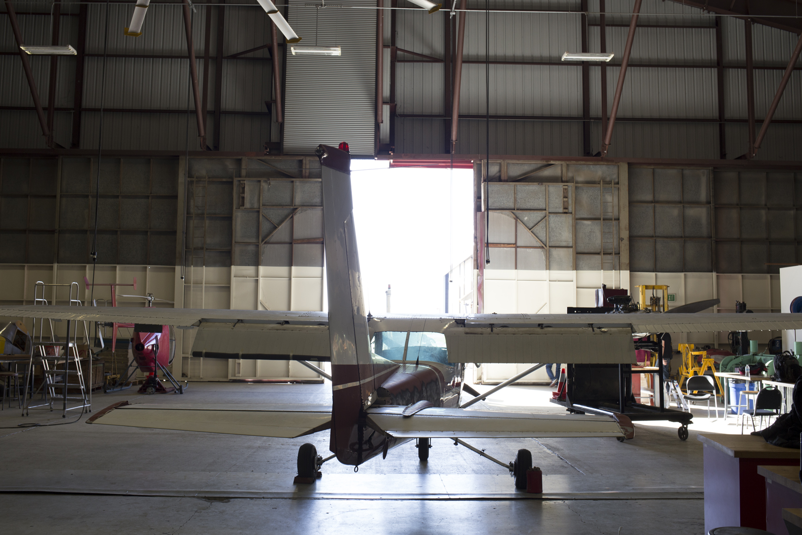 As the sun glares down on the airfield, a few students open the hangar door — almost as large as the end of the hangar itself — letting in a large beam of sunlight.